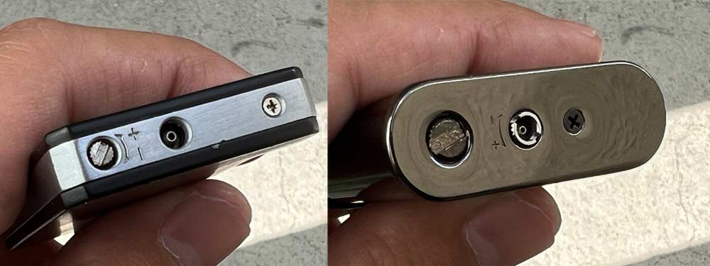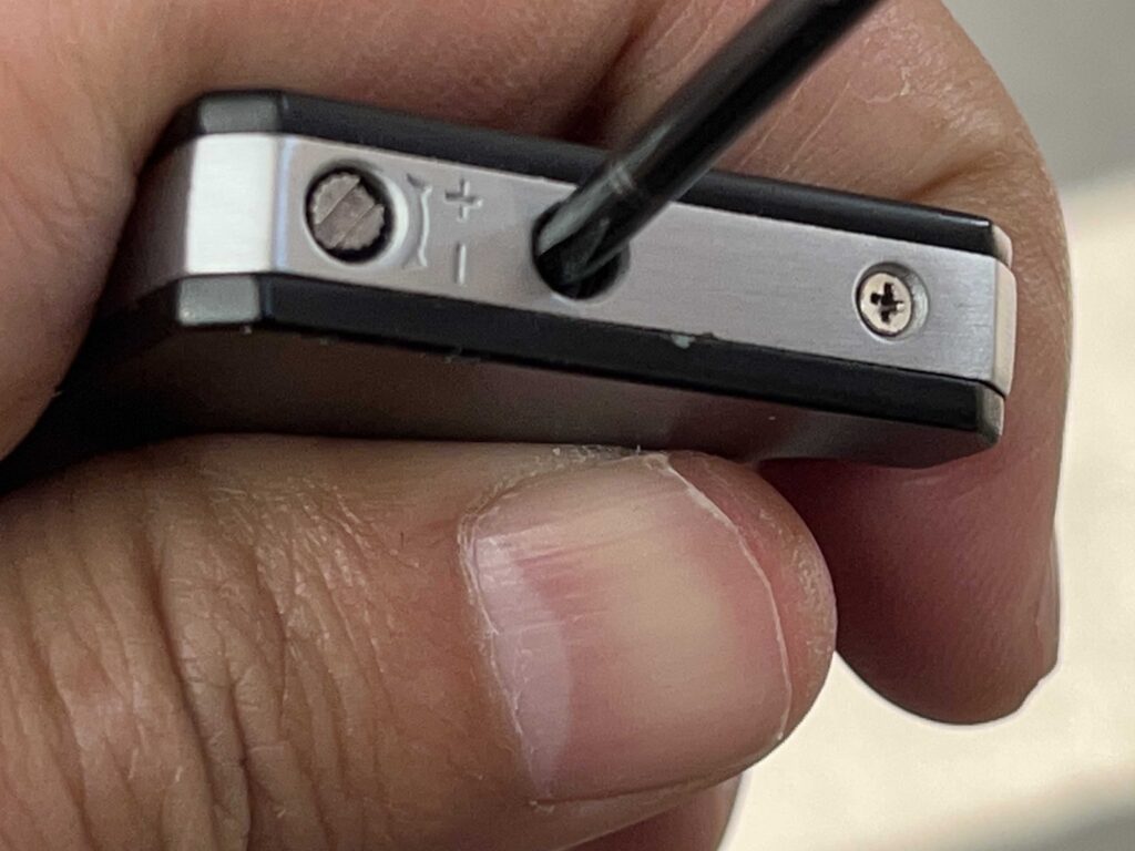 ガスの注入口を細いドライバーやラジオペンチの先などで押し込むと中のガスが出てきます、勢いよく出てくることもあるのでゆっくり押し込んでください。