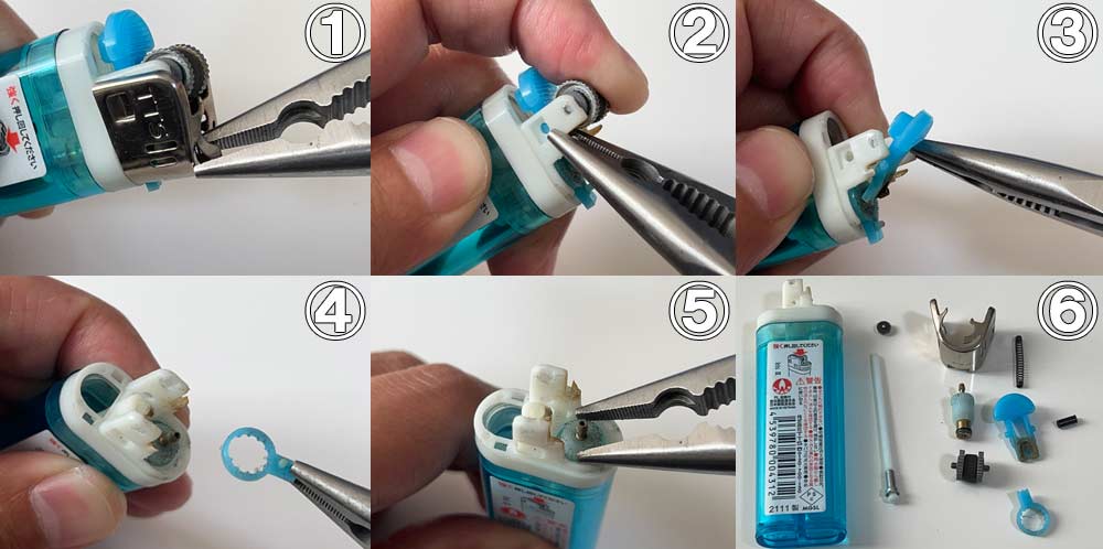 まずは火気の無い場所を確保、ユニットを抜いてフリントスプリング石を外します。あとはラジオペンチや細いドライバーで中身の芯と綿を抜くだけ、簡単ですね。