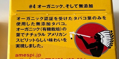 そしてオーガニック栽培のたばこ葉のみを使用したシガレットであることを箱の裏にもバッチリ書いてあります、もっと主張してもいいと思う。