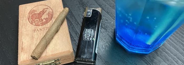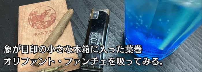 で、ファンチェのサイズ感はこんな感じ。うん、小さくてかわいいね。使い捨てライターよりちょっと短く、キングサイズのシガレットくらいの太さです。で、そのもの匂いとしてはほんのりと濡れた土のような匂いと木のような香り。決して強い物ではありませんでしたが、プレミアムシガーの匂いを薄めたような感じの心地良い香りです。