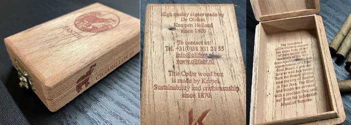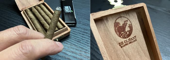 オリファント、正式な表記は「DE OLIFANT」と書かれます。ちょくちょく見かける象さんの描かれたかわいらしい木箱入りの葉巻。警告ステッカーが邪魔に感じる(だいたいはそう感じますが…)小さくておしゃれな箱に入った世界最小の葉巻でございます。