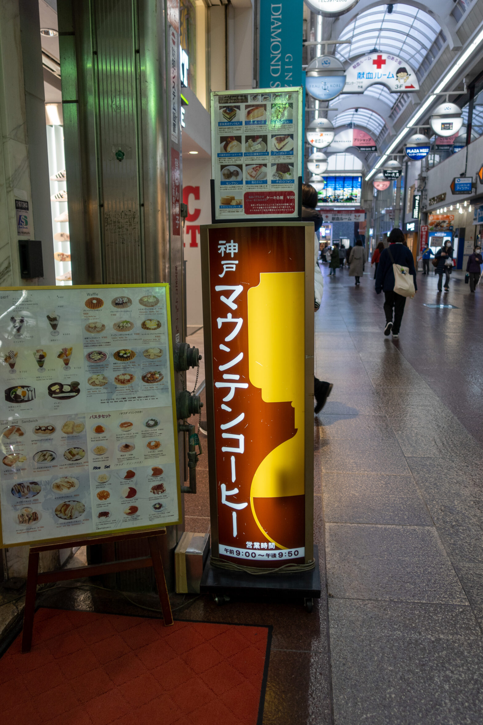 神戸センター街、元町よりの出口手前にある喫茶店。地下にあるのにマウンテンという名の喫茶店をご案内します。メニューはカレーやパスタ、サンドイッチにパフェやワッフルと色々あります。おなかが空いていても大丈夫なメニュー群となっております。ワッフルは何度か食べた事がありますが、ボリュームあっておいしいのでおすすめです。
